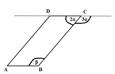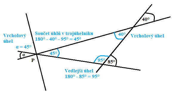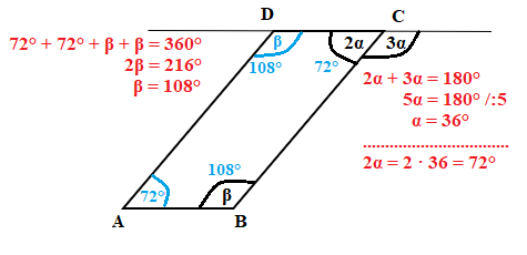 Úhly 2α a 3α tvoří dohromady přímý úhel 180°. Součet vnitřních úhlů čtyřúhelníku je 360°.